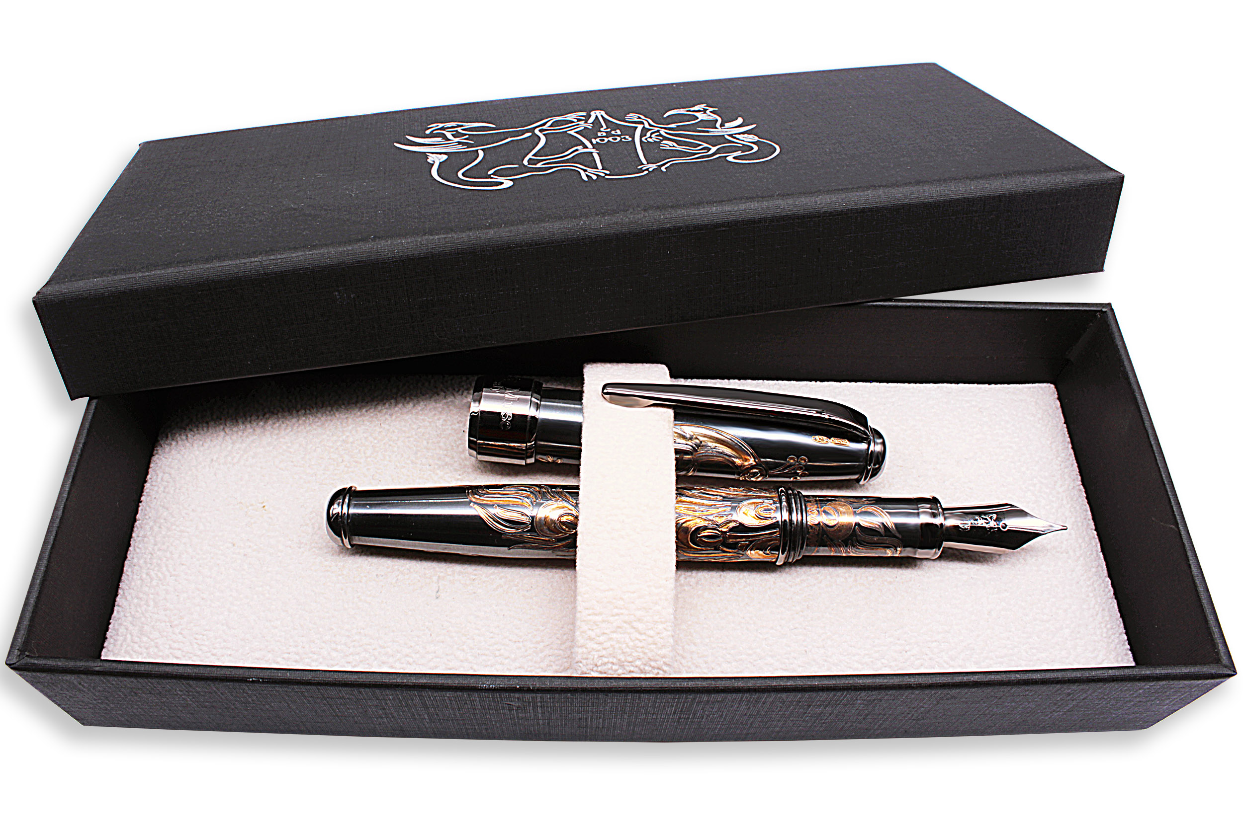 Cappuccio e corpo della penna stilografica Pavone sono realizzati in argento sterling 925, ciascun pezzo punzonato per garantirne l’autenticità. Una speciale ossidazione conferisce alla penna la finitura multicolore che richiama il piumaggio cangiante del pavone. Anche il puntale, sempre in argento sterling, è inciso con il numero dell’edizione limitata e con una piccola piuma.