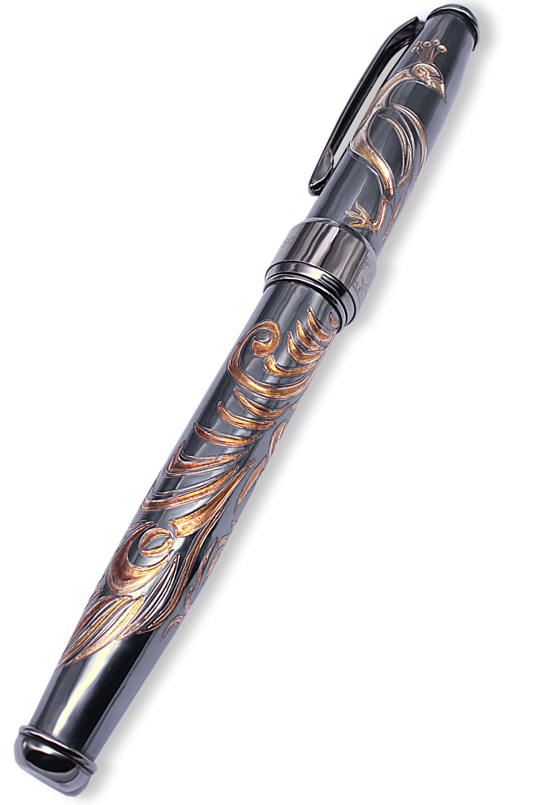 I nostri artigiani hanno creato una nuova collezione di penne stilografiche in argento sterling ispirate al pavone (Pavo in latino). Il design segue armoniosamente la forma naturale della penna: la testa e il corpo del pavone sono finemente incisi sul cappuccio, mentre la coda abbassata avvolge elegantemente il fusto, conferendo movimento e raffinatezza.