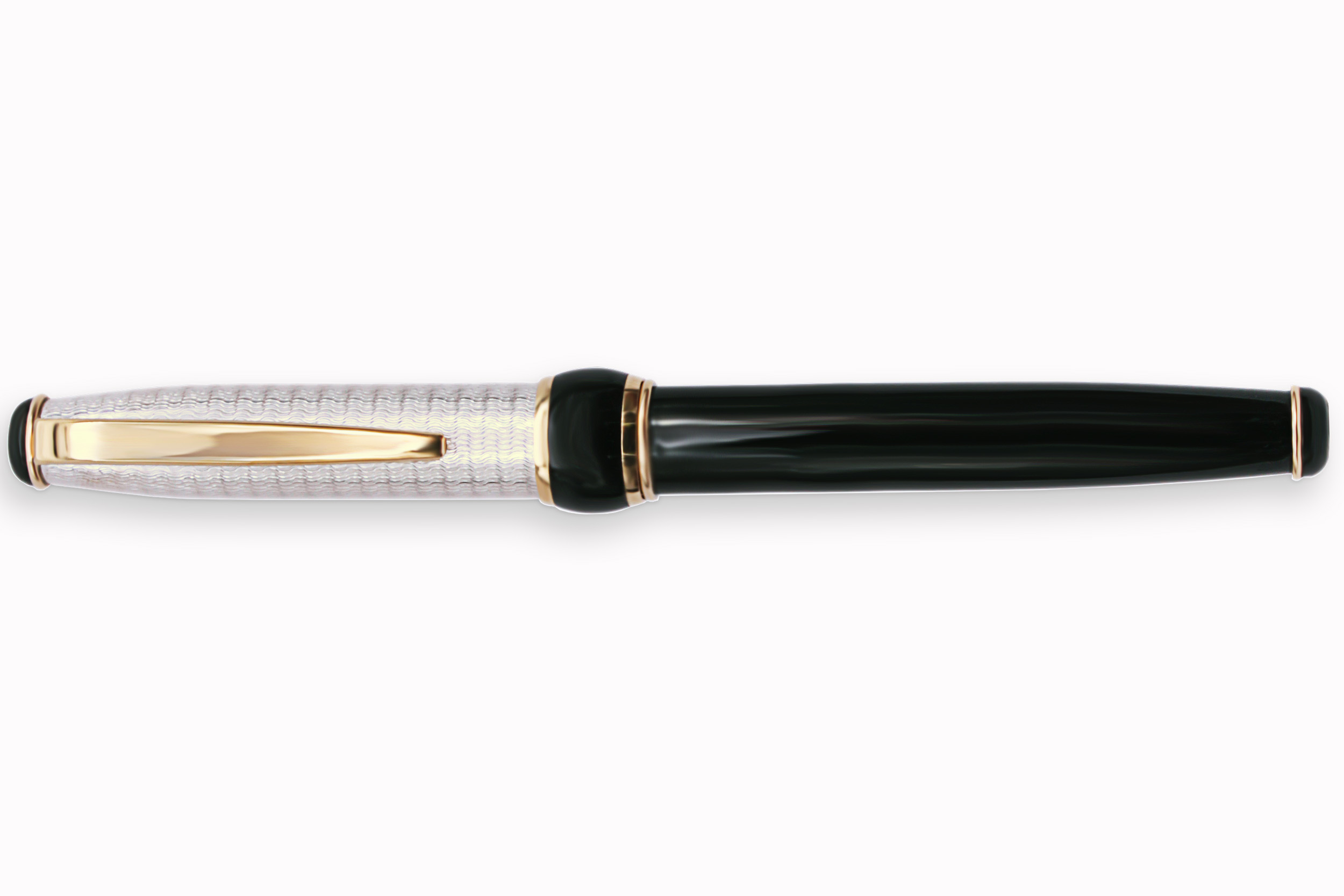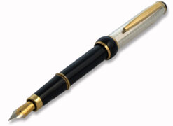 Elegant handcrafted fountain pen in solid 925 sterling silver and black lacquer. Customisable, with steel or 18k gold nib options. Includes gift box.